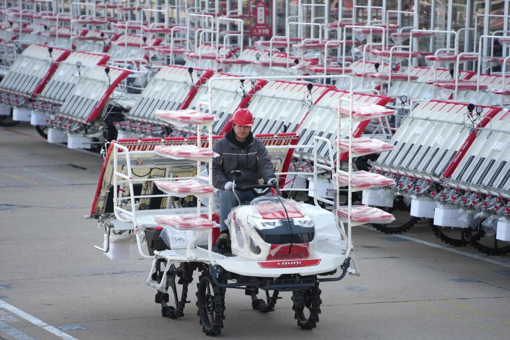 2月19日,工人在位于潍坊市的潍柴雷沃智慧农业科技股份有限公司物流仓储区停放刚生产的插秧机。新华社记者 徐速绘 摄