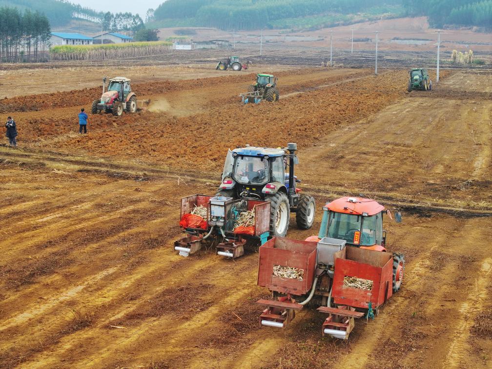 2月19日,在广西来宾市兴宾区凤凰镇国家现代农业产业园黄安优质“双高”糖料蔗基地,农民驾驶农机在田间作业(无人机照片)。新华社记者 周华 摄传统的农机设备有旋耕机、插秧机