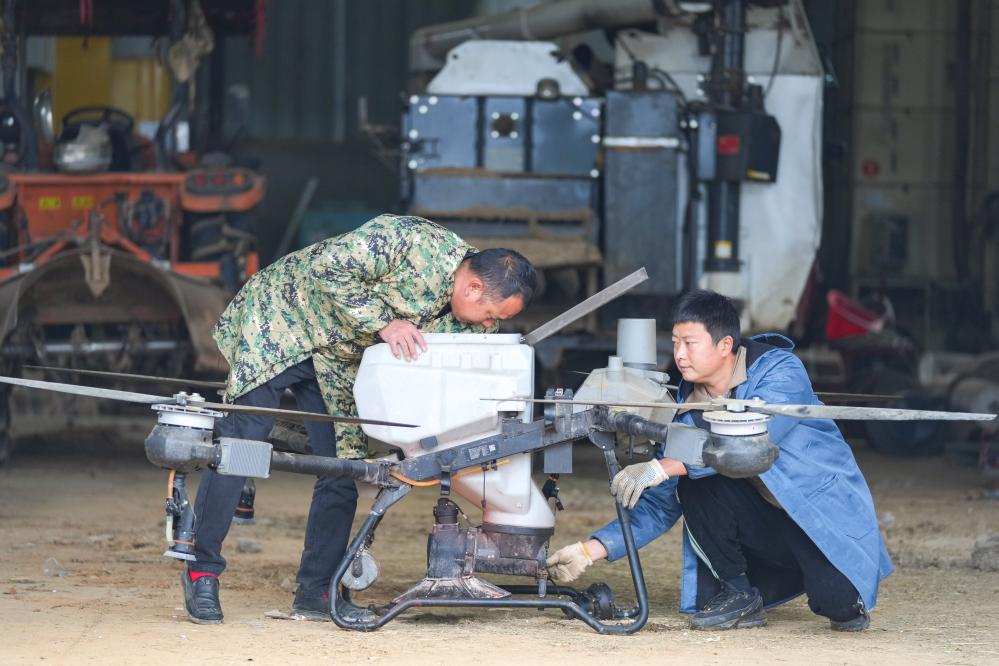 2月20日,在湖南省浏阳市龙伏镇的鼎钧种养专业合作联合社,工作人员在检修植保无人机。新华社记者 陈泽国 摄水肥一体化技术