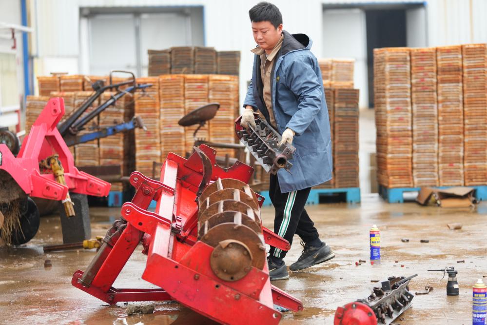 2月20日,在湖南省浏阳市龙伏镇的鼎钧种养专业合作联合社,工作人员在更换旋耕机配件。新华社记者 陈泽国 摄