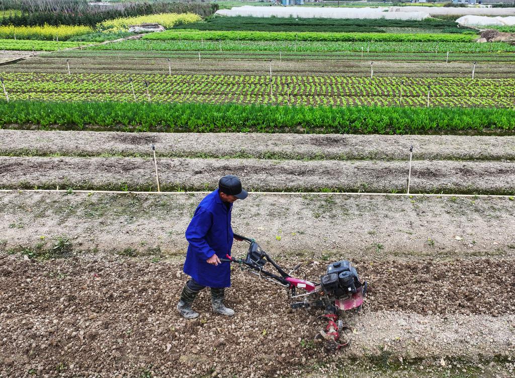 2月5日,在广西南宁市西乡塘区石埠街道下灵村蔬菜种植基地,农民驾驶农机翻耕土地(无人机照片)。 新华社发(喻湘泉摄)
