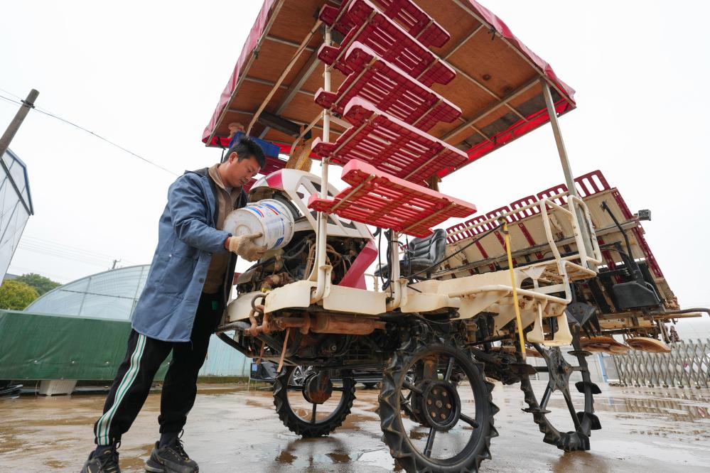 2月20日,在湖南省浏阳市龙伏镇的鼎钧种养专业合作联合社,工作人员在给插秧机添加防冻冷却液。新华社记者 陈泽国 摄