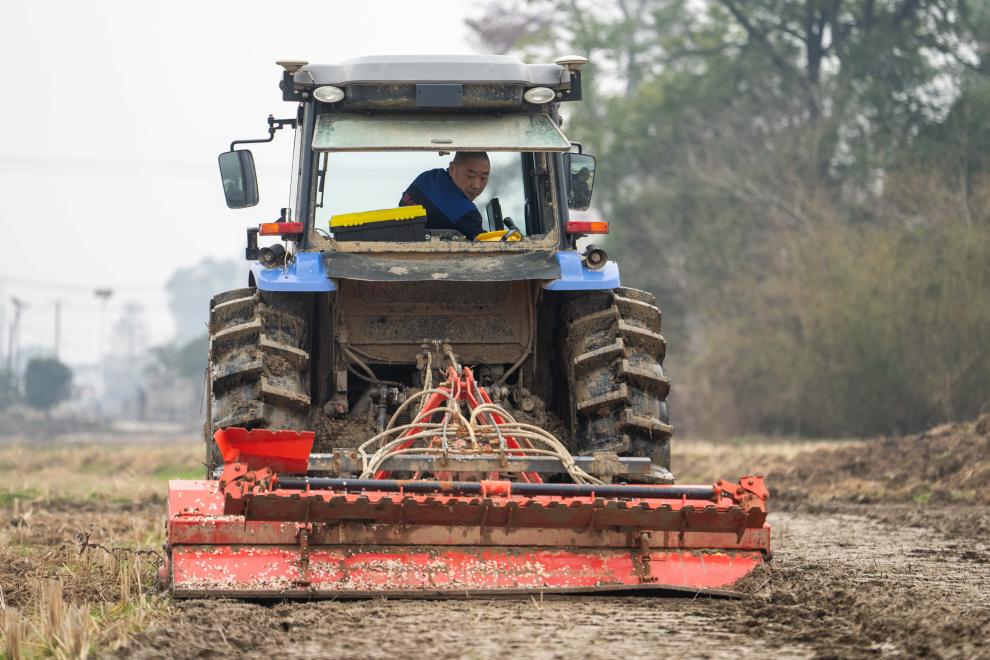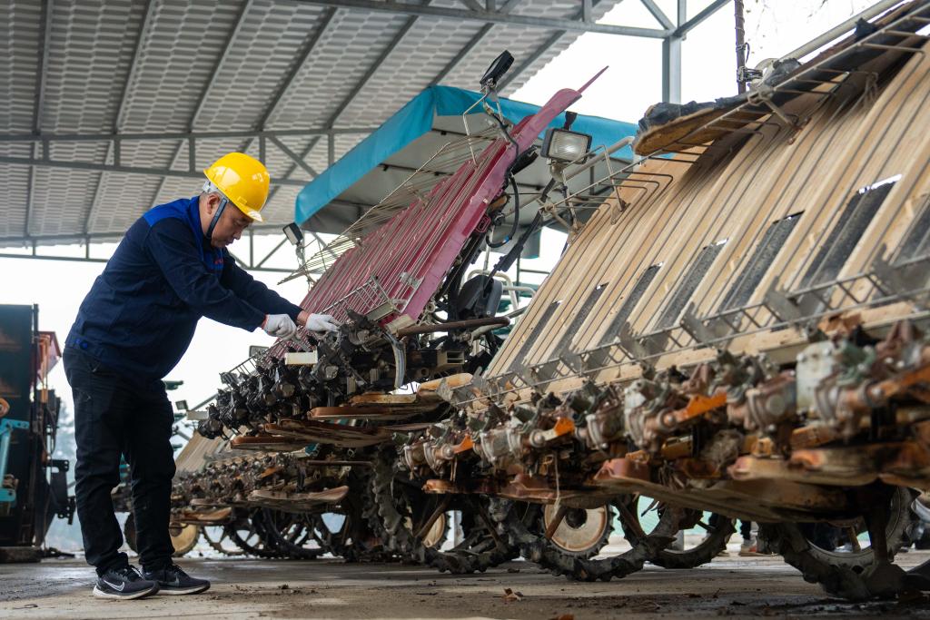 2月21日,在长沙市望城区桥驿镇群力村,农机技术人员在检测调试旋耕设备。新华社记者 陈思汗 摄插秧机