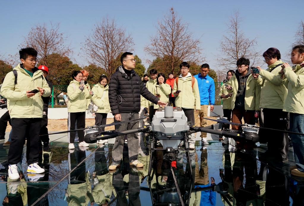 2月18日,在上海昆秀水产专业合作社,行业导师许翔为学生介绍用于播撒饲料、施肥的植保无人机。新华社记者 刘颖 摄