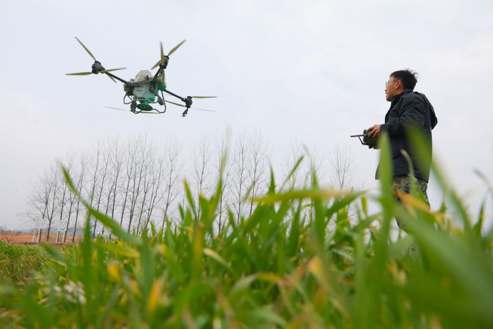 2月14日,在浙江省杭州市临安区天目山镇“天目粮仓”粮食功能区,农机人员遥控植保无人机给小麦施肥。 新华社发(胡剑欢摄)