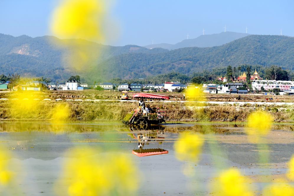 2月7日,在云南省西双版纳州勐海县曼朗村,插秧机在插秧。新华社发(佐连江 摄)