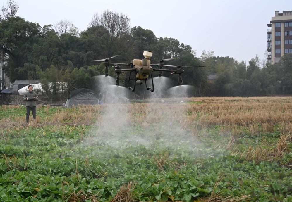 2月3日,浙江省金华市武义县东干村种粮大户朱美良操控植保无人机,对规模种植的油菜喷施叶面肥。新华社发(张建成 摄)