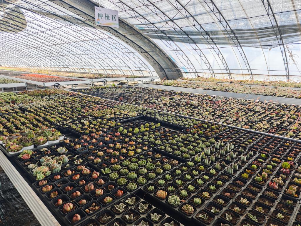 在规模效应的带动下,越来越多的年轻人加入了种植多肉植物的队伍。原本从事客服工作的秦晓刚就被多肉植物产业的发展势头所吸引,他不仅租了9个种植大棚,还开起了网店,通过直播带货增加销量。