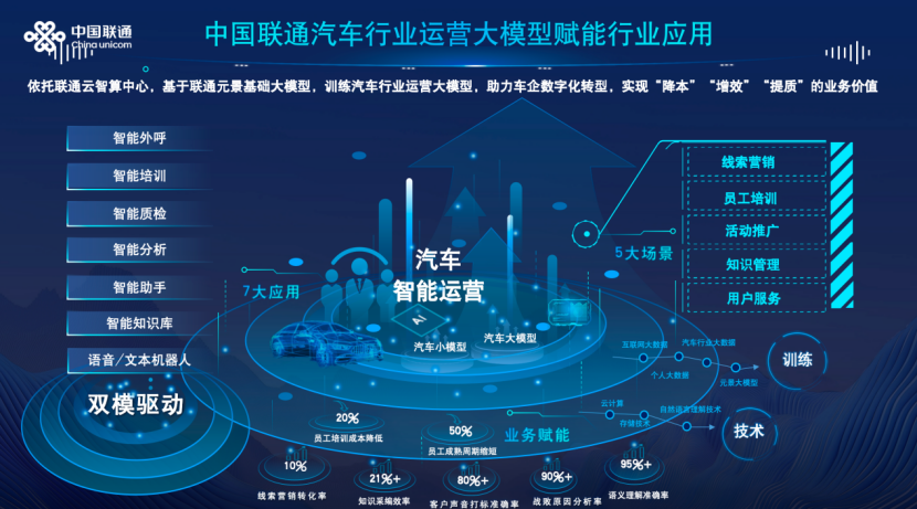 中国联通基于元景MaaS 2.0,以行业数据训练为基础,打造汽车行业数智运营大模型,面向具体场景以更低的门槛、更高的效率研发AI工具,提供全链路的AI车联网运营服务,旨在帮助车企实现运营过程的智能化、自动化和高效化。