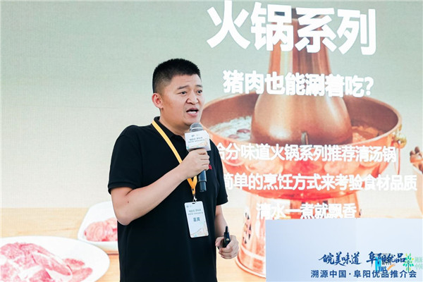 拾分味道食品集团有限公司招商总监周玉推介了特色猪肉产品。拾分味道是上市公司的全资子公司,拥有猪肉全产业链,位于安徽临泉的工厂生产线全球领先。重点产品“飘香肉”清水煮即飘香,可涮食,品质极佳;水晶五花肉仅加盐,经特殊工艺处理得肥而不腻、瘦而不柴。另有咸蛋黄狮子头、美佳黑猪肉酱(猪肉含量超30%)、八大零添加纯猪肉烤肠等。周玉还分享了公司抖音账号及活动,方便了解购买。