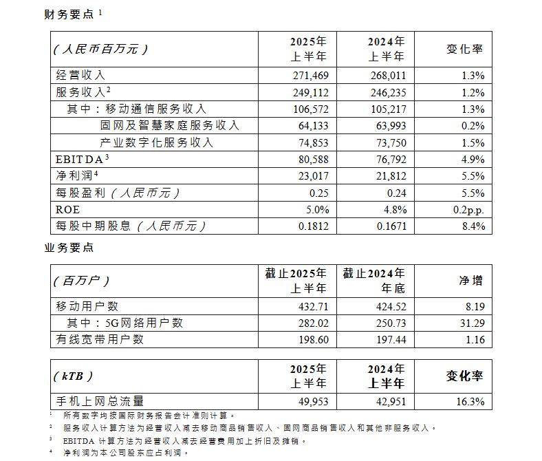 2025年上半年,公司移动通信服务收入达到1,066亿元,同比增长1.3%;固网及智慧家庭服务收入达到641亿元,同比增长0.2%;移动用户达到4.33亿户,宽带用户达到1.99亿户,移动用户ARPU达到46.0元,宽带综合ARPU达到48.3元。
