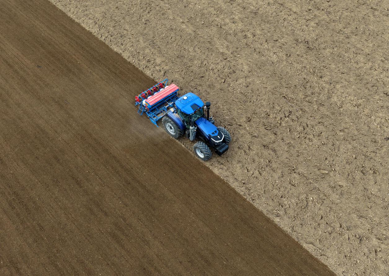 在河南省清丰县固城镇张庄里村,无人驾驶拖拉机在进行旋耕播种复合作业。新华社记者李嘉南 摄