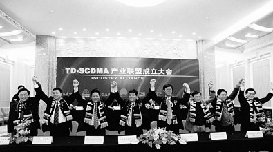 2002年10月30日,TD-SCDMA产业联盟召开成立大会,8家企业代表佩戴联盟围巾高举双手。 [详细]