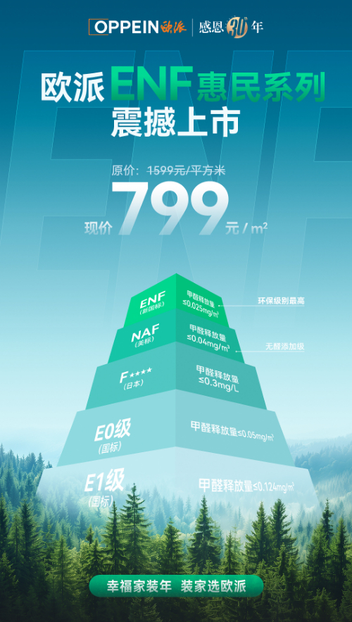 除此之外,为进一步响应国家政策号召,欧派在30周年针对其ENF级净醛抗菌爱芯板产品推出绿色家居惠民活动,以799元/㎡的震撼价颠覆市场预期,满足了广大消费者对低成本、高价值的需求。