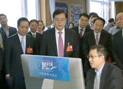 2014年3月12日,中共中央政治局常委、全国人大常委会委员长张德江在北京人民大会堂看望参加十二届全国人大二次会议新闻报道工作的中央主要媒体负责人和工作人员,代表大会主席团向所有参加人大会议报道的新闻工作者表示诚挚慰问和衷心感谢。这是张德江来到设在人民大会堂内的新华社两会新闻报道中心观看新华网专题报道演示。
