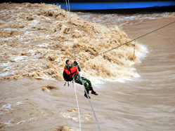 陈华军熟练地用抛绳枪搭建起“空中救援通道”,跃上绳桥,手脚并用,蹂身前进,一步步的攀爬靠近被困群众。在他身下,就是汹涌咆哮的洪水!