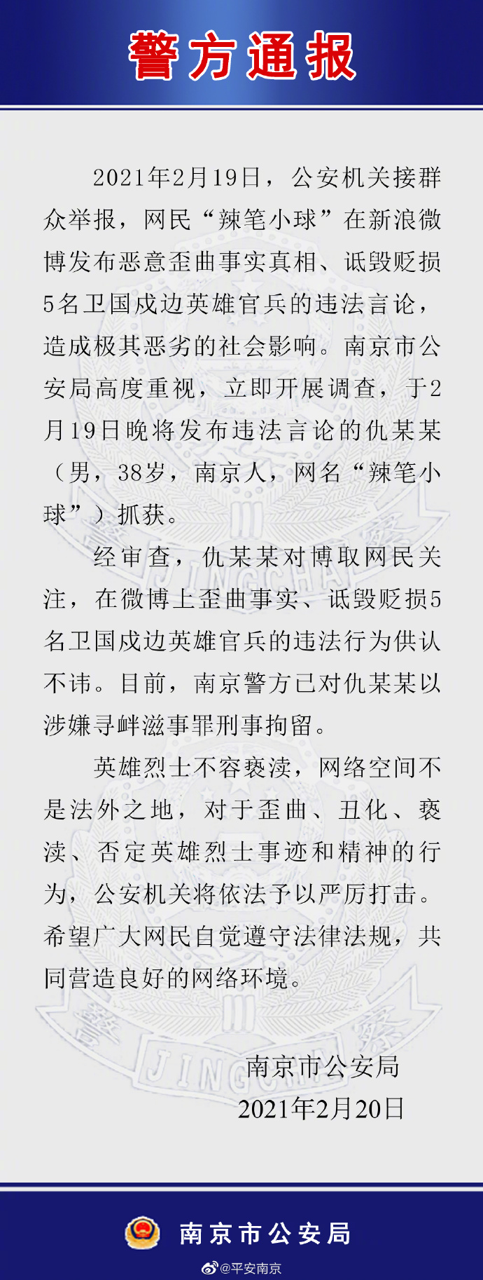 江苏省南京市公安局官方微博20日发布通报称,2021年2月19日,公安机关接群众举报,网民“辣笔小球”在新浪微博发布恶意歪曲事实真相、诋毁贬损5名卫国戍边英雄官兵的违法言论,造成极其恶劣的社会影响。南京市公安局高度重视,立即开展调查,于2月19日晚将发布违法言论的仇某某(男,38岁,南京人,网名“辣笔小球”)抓获。