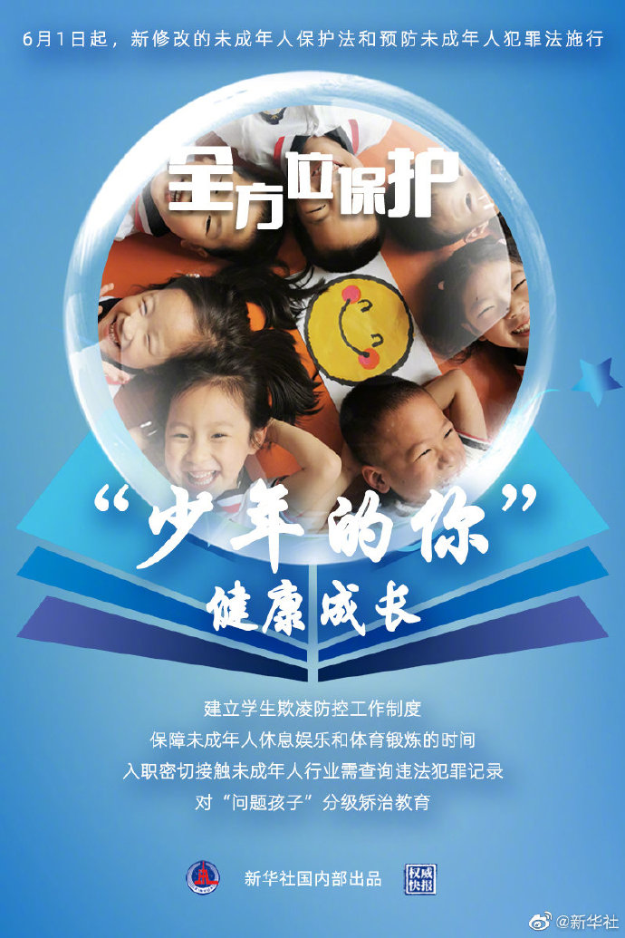 新修改的未成年人保护法和预防未成年人犯罪法,将从今年“六一”国际儿童节起正式施行。与现行法律相比,两部法律针对一些监护人不依法履行监护责任、校园欺凌时有发生等热点难点问题进一步作出规定。新法建立了学生欺凌防控工作制度、密切接触未成年人行业违法犯罪记录入职查询制度等,并进一步保障未成年人休息、娱乐和体育锻炼的时间,完善未成年人心理干预机制,全方位保护未成年人的健康成长。保护好孩子,就是保护好我们的未来!(记者白阳、陈菲,海报设计张晨光)