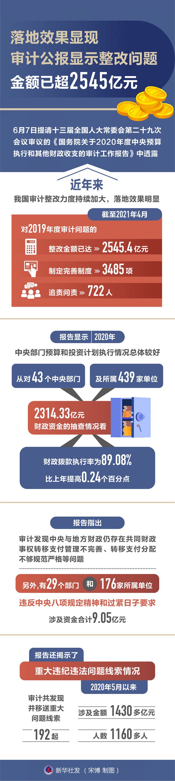新华社北京6月7日电(吴昊、邹多为)近年来,我国审计整改力度持续加大,落地效果明显:截至2021年4月,对2019年度审计问题的整改金额已达2545.4亿元,制定完善制度3485项,追责问责722人。