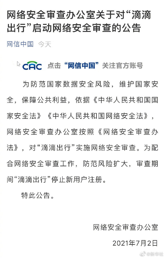 网络安全审查办公室2日发布公告称,为防范国家数据安全风险,维护国家安全,保障公共利益,依据《中华人民共和国国家安全法》《中华人民共和国网络安全法》,网络安全审查办公室按照《网络安全审查办法》,对“滴滴出行”实施网络安全审查。为配合网络安全审查工作,防范风险扩大,审查期间“滴滴出行”停止新用户注册。(记者王思北)