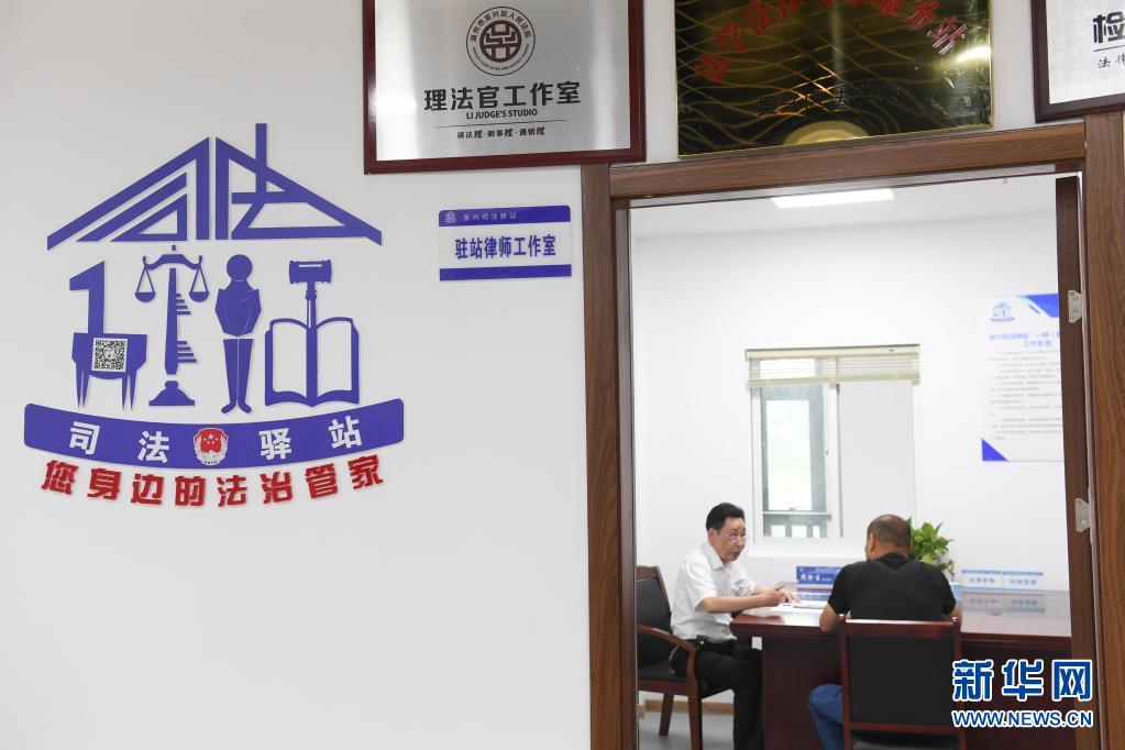 在浙江湖州吴兴区八里店镇三合片区党群服务中心“司法驿站”,律师志愿者(左)在提供法务咨询(2020年7月21日摄)。新华社记者 翁忻旸 摄