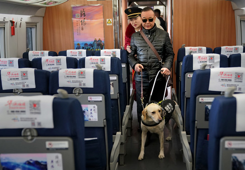 2020年1月14日,一名旅客携导盲犬在郑州东站登上列车。新华社记者 李安 摄