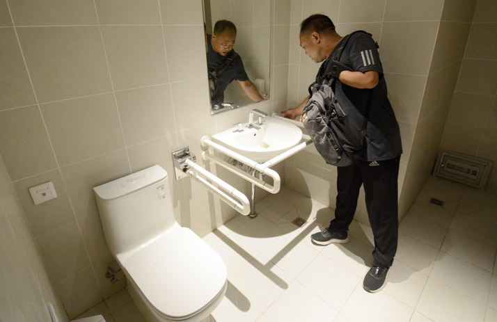 图为无障碍专家在北京延庆赛区冬奥村检查室内卫生间无障碍设施(2021年7月15日摄)。新华社记者 李欣 摄