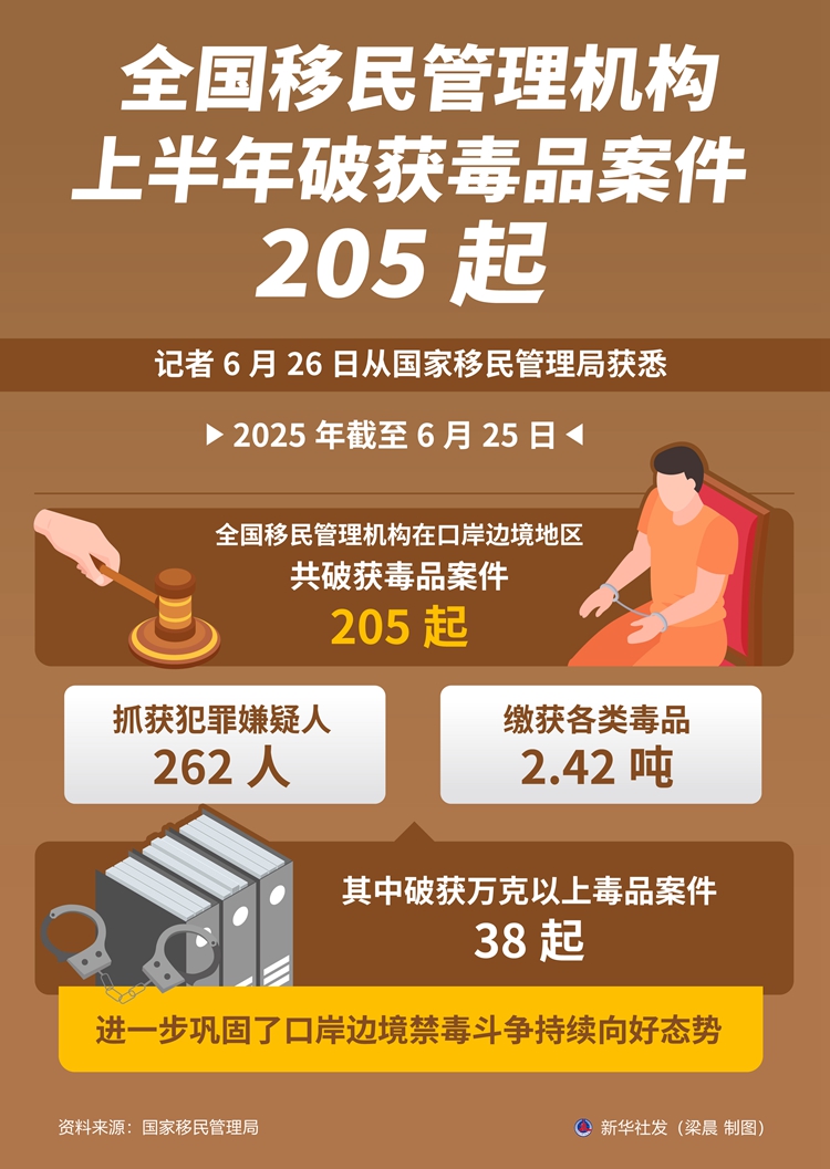 新华社北京6月26日电(记者 任沁沁)记者26日从国家移民管理局获悉,今年截至6月25日,全国移民管理机构在口岸边境地区共破获毒品案件205起,抓获犯罪嫌疑人262人,缴获各类毒品2.42吨,其中破获万克以上毒品案件38起,进一步巩固了口岸边境禁毒斗争持续向好态势。