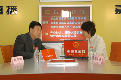 2009年2月20日15时,农业部国家首席兽医师于康震、卫生部应急办公室副主任梁东明和国家流感中心主任舒跃龙接受中国政府网专访,就“齐心协力、做好人感染高致病性禽流感防控工作”与网友在线交流。 欢迎网民踊跃提问,积极参与! [提问与点评] |