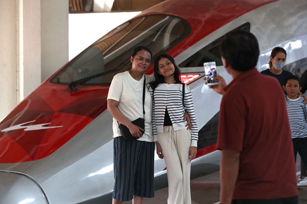 在印度尼西亚雅加达哈利姆站站台,两名乘客与雅万高铁高速动车组列车合影。(新华社)