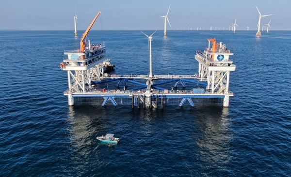 这是在广东汕尾拍摄的中广核“伏羲一号”风渔融合网箱平台(无人机照片)。新华社记者邓华 摄