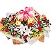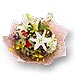 白色香水百合4枝,红色玫瑰6枝,文心兰4枝,满天星、孔雀草