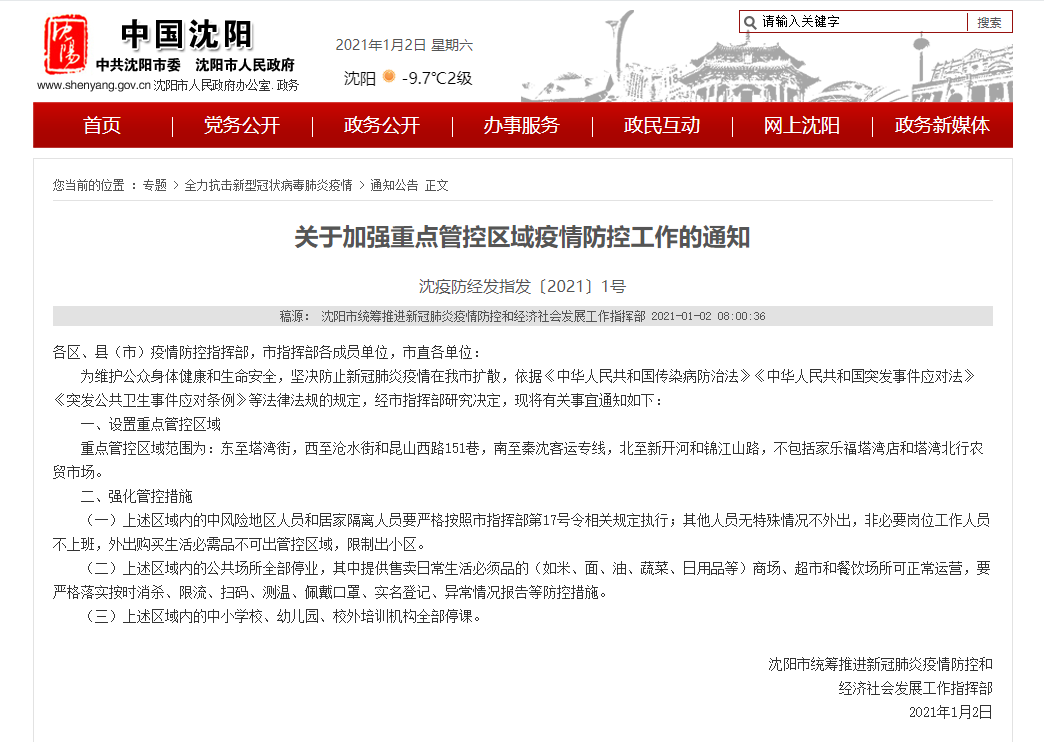 沈阳市统筹推进新冠肺炎疫情防控和经济社会发展工作指挥部2日发布《关于加强重点管控区域疫情防控工作的通知》(以下简称《通知》)称,为维护公众身体健康和生命安全,坚决防止新冠肺炎疫情在沈阳扩散,该市设置重点管控区域。
