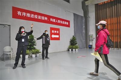 昨日,朝阳规划艺术馆,工作人员引导接种人员前往接种区。 新京报记者 王飞 摄