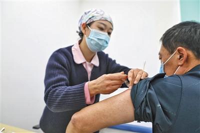 昨日记者在丰台区花乡一处接种点看到,疫苗接种正有序进行,现场接种的包括物流人员、公共场所扫码测温工作人员等重点人群。