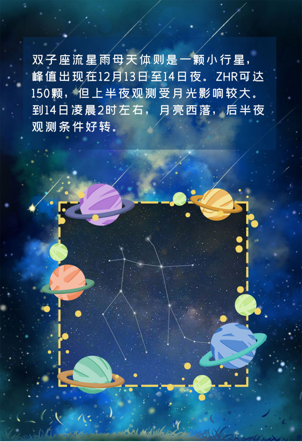 双子座流星雨母天体则是一颗小行星,峰值出现在12月13日至14日夜。ZHR可达150颗,但上半夜观测受月光影响较大。到14日凌晨2时左右,月亮西落,后半夜观测条件好转。