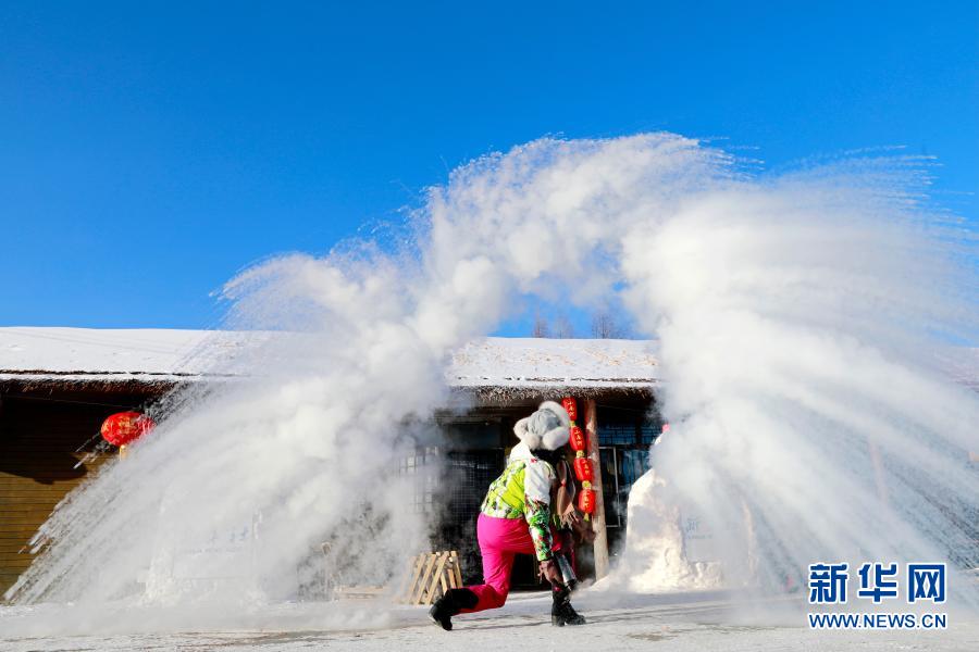 在黑龙江省双鸭山市饶河县西林子乡小南河村,游客薛福香在游客服务中心门前体验泼水成冰(2020年12月31日摄)。新华社发(徐义 摄)