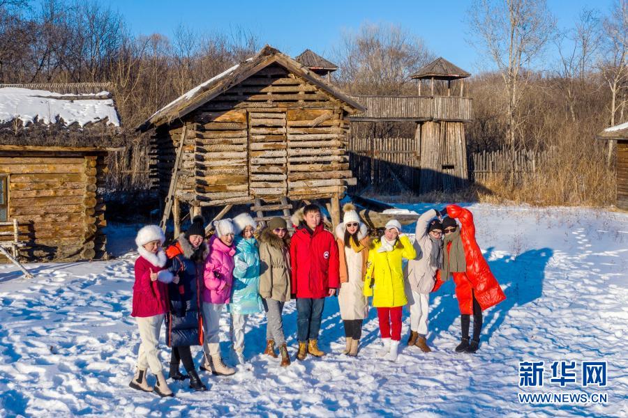 在黑龙江省双鸭山市饶河县西林子乡小南河村,游客在黑金部落民俗景区合影(2020年12月30日摄)。新华社发(徐义 摄)
