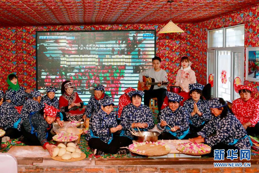 在黑龙江省双鸭山市饶河县西林子乡小南河村,村民们盘坐在土炕上展示包饺子、蒸馒头等东北民俗(2020年12月31日摄)。新华社发(徐义 摄)