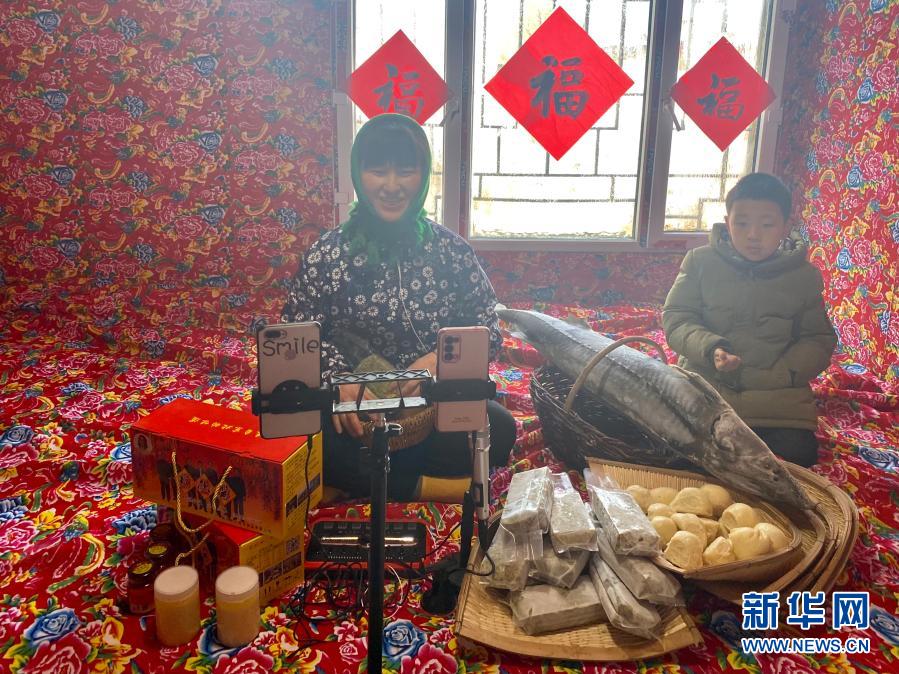在黑龙江省双鸭山市饶河县西林子乡小南河村,小剧团团长刘伶俐在游客服务中心直播带货(2020年12月31日摄)。新华社记者 杨思琪 摄