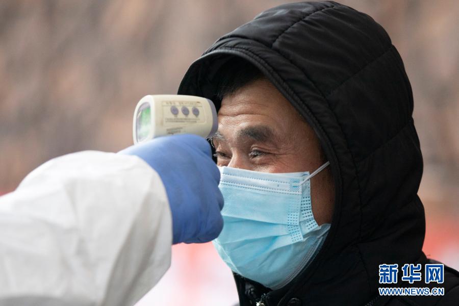 1月15日,志愿者在望奎县华腾园小区内为居民测量体温。 新华社发(张涛 摄)