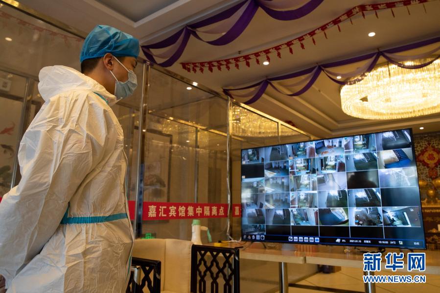 1月15日,工作人员在望奎县嘉汇酒店内观看监控。 新华社发(张涛 摄)