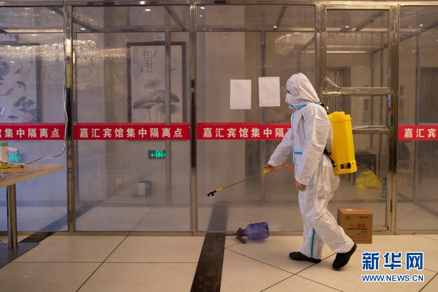 1月15日,隔离点医护人员在望奎县嘉汇酒店集中隔离点进行消杀作业。 新华社发(张涛 摄)