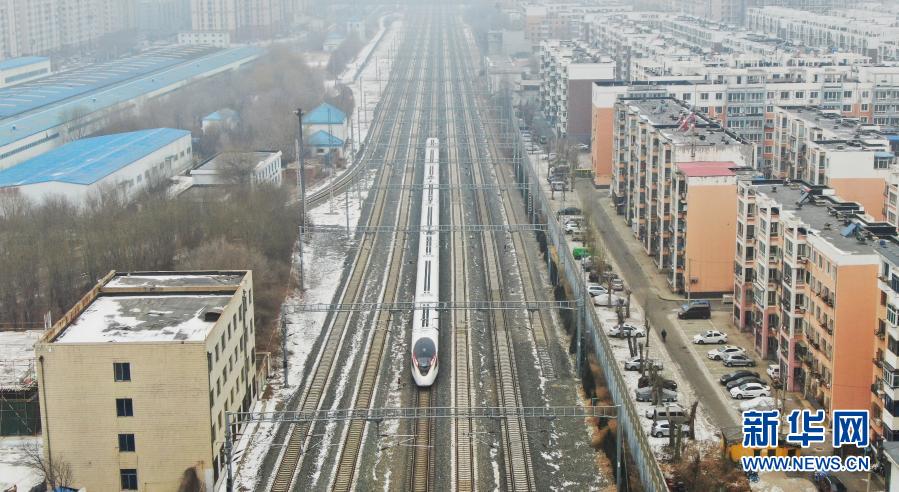 1月22日,在沈阳珠江桥附近,一辆从沈阳北站开往北京朝阳站的复兴号列车行驶在京哈高铁线上(无人机照片)。