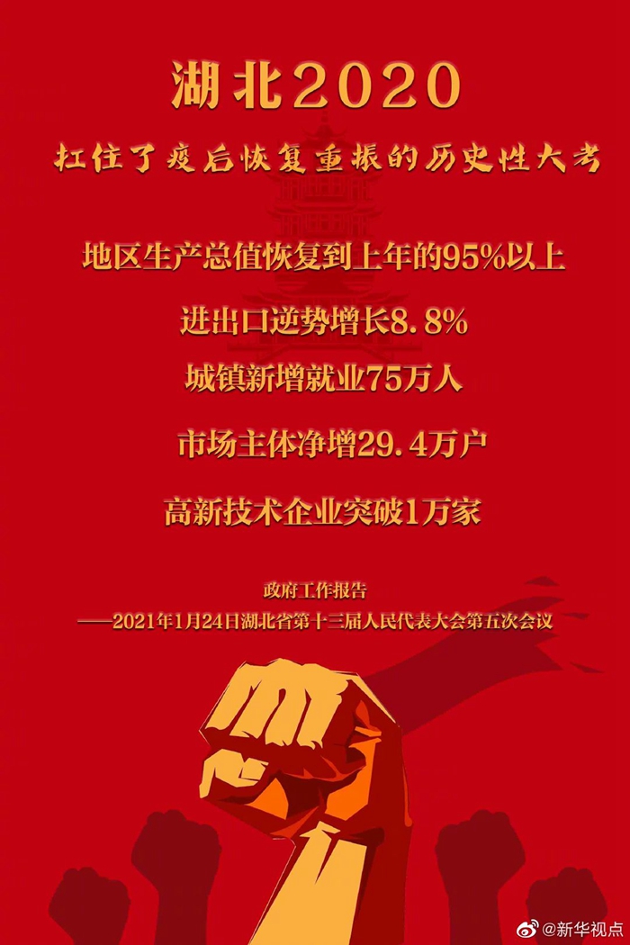 1月24日,湖北省十三届人大五次会议开幕,湖北省省长王晓东作政府工作报告。报告指出,2020年湖北地区生产总值恢复到上年的95%以上。进出口逆势增长8.8%。城镇新增就业75万人。市场主体净增29.4万户。高新技术企业突破1万家。(记者熊琦)