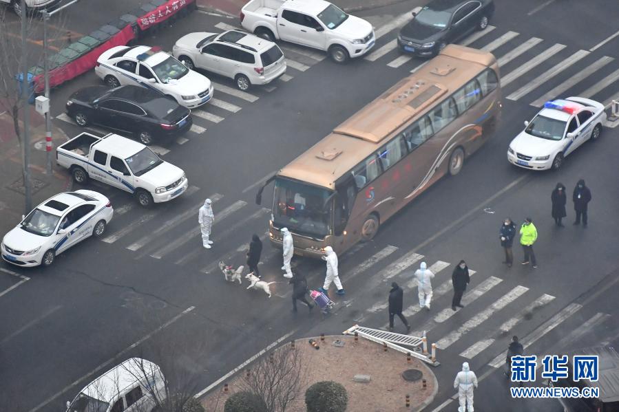 1月25日,在北京市大兴区天宫院街道融汇小区,两名居民带着宠物狗准备登车前往集中隔离点。新华社记者 孙瑞博 摄
