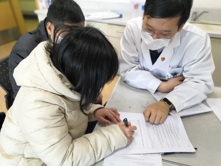 王智超为神经纤维瘤病患者讲解临床试验内容。(上海交大医学院附属第九人民医院提供)