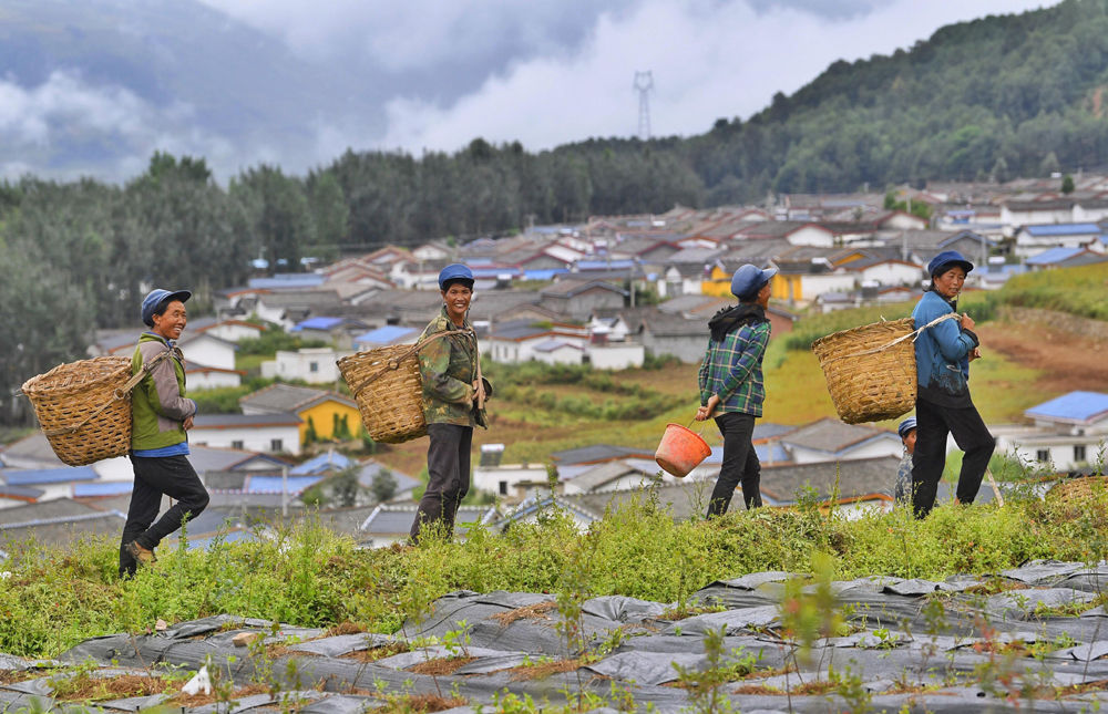 2020年8月13日,四川省凉山彝族自治州布拖县拖觉镇老吉村的妇女在去往蓝莓种植基地务工的路上。新华社记者 刘坤 摄