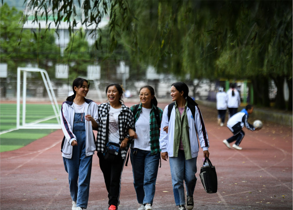 2020年9月6日,越西县西城中学,莫色小兰(左二)和学生在操场上散步。新华社记者 王曦 摄