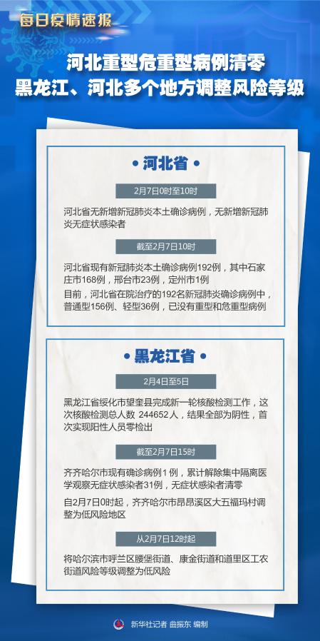 新华社北京2月7日电 7日,各地新冠肺炎疫情防控工作再传佳音:河北重型和危重型病例清零,齐齐哈尔市无症状感染者清零。黑龙江、河北多个地方调整风险等级。